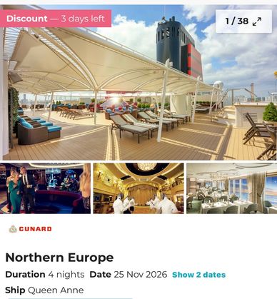 A considered price for this cruise with an amazing itinerary and a great ship sailing from Southampton this May. If you can find any cruise for around £100 a night it’s a good bench mark to keep in mind.